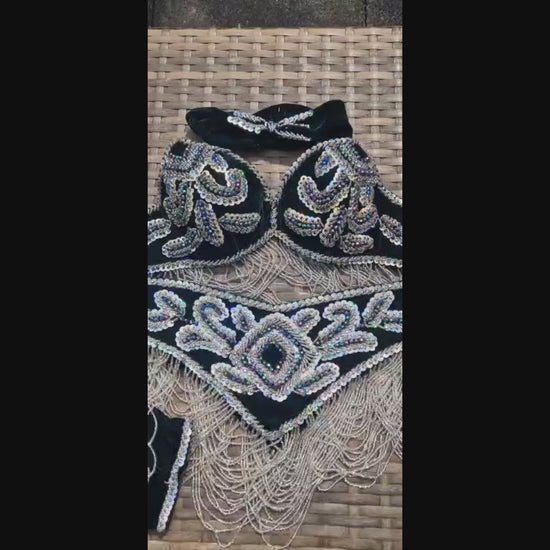 Bauchtanzkostüm aus dunkelgrünem Samt. BH, Gürtel und Schmuck