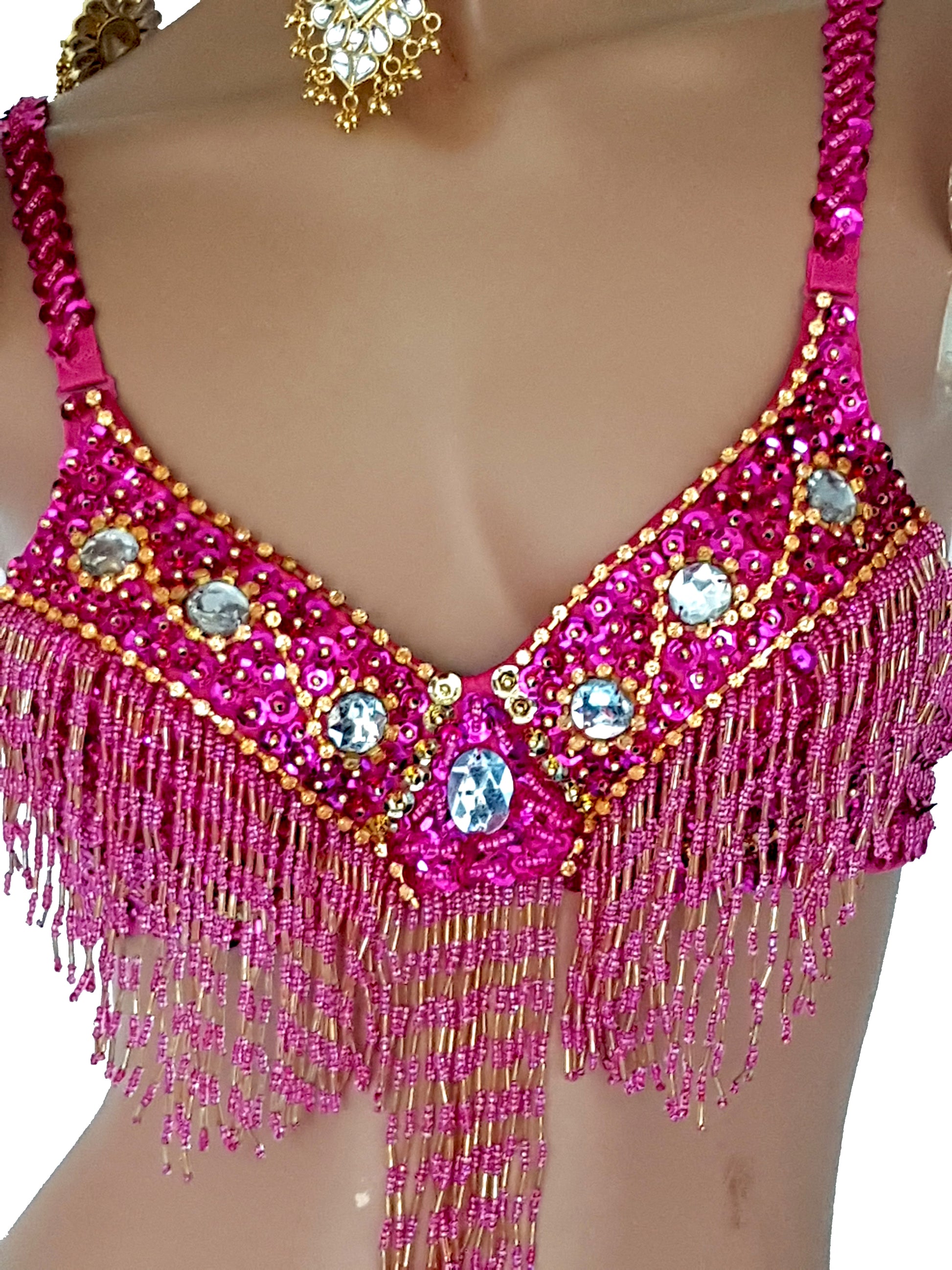 Fuchsiafarbener BH mit goldenen Pailletten und silbernen Strasssteinen.