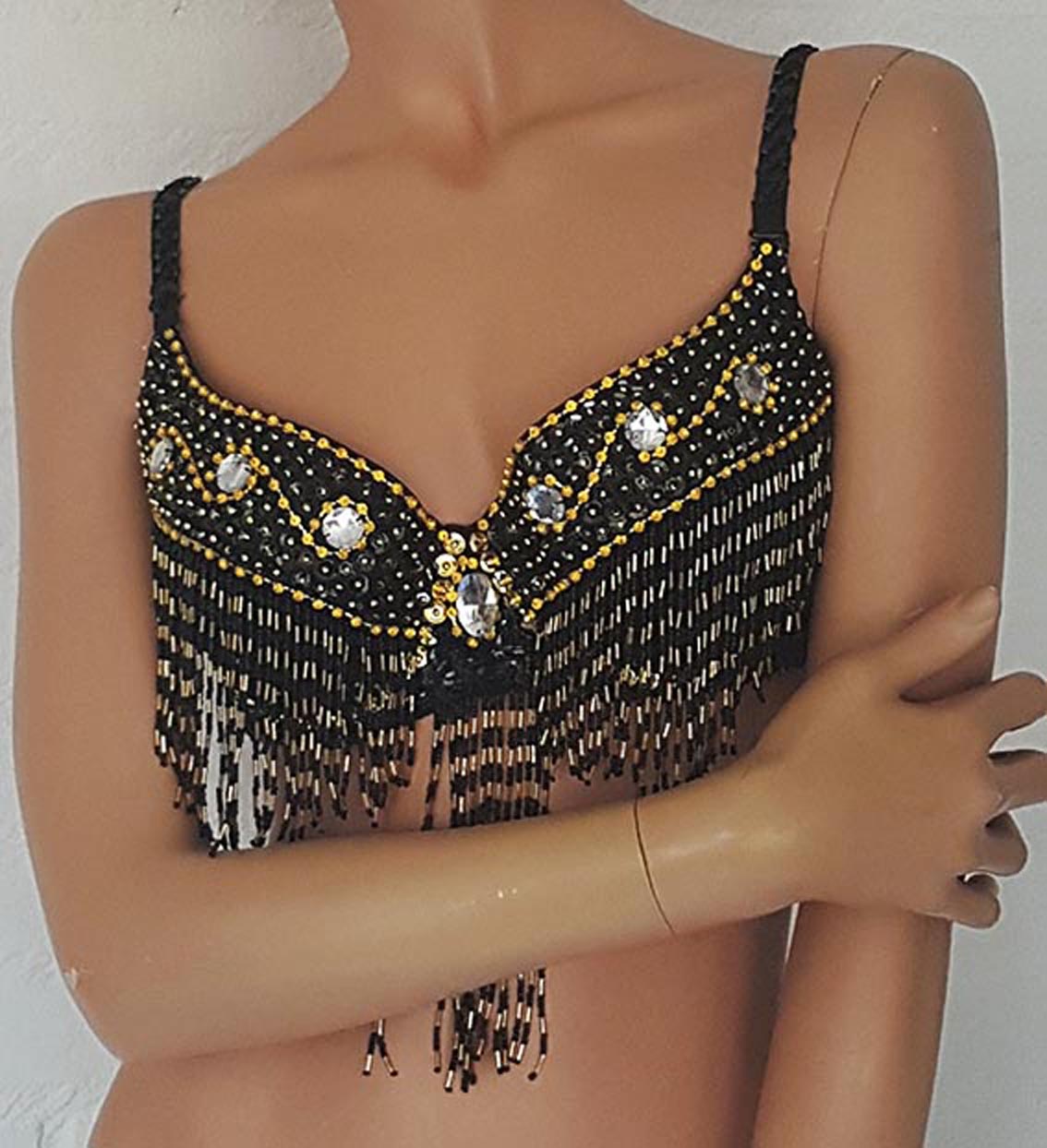 Schwarzer BH mit goldenen Pailletten und silbernen Strasssteinen.
