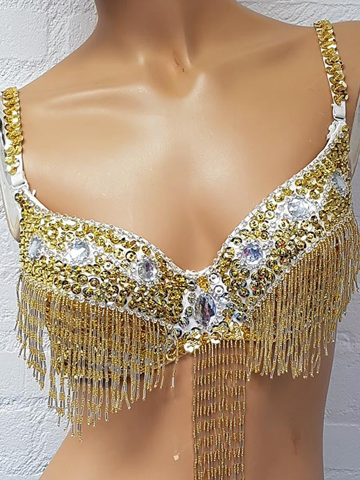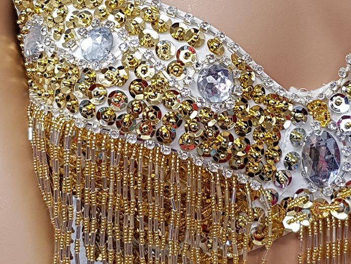 Goldener BH mit goldenen Pailletten und silbernen Strasssteinen.
