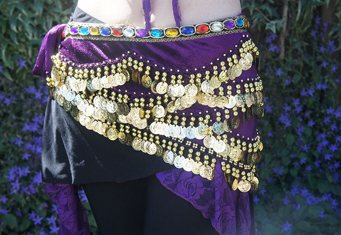 Bauchtanz-Hüfttuch mit Steinen gewellt in Lila, mit Goldmünzen