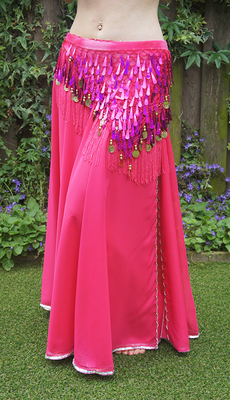 Bauchtanzrock in Fuchsie mit Schlitz, mit silbernen Perlen verziert.