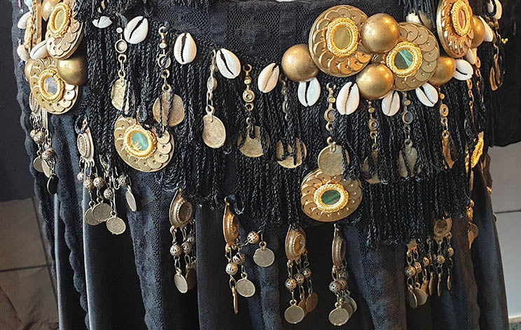 Der Gürtel ist mit echten Kauri-Muscheln und Spiegeln verziert, was für eine zauberhafte und bezaubernde Optik sorgt. Fügen Sie dieses einzigartige und anmutige Set Ihrer Bauchtanzsammlung hinzu und lassen Sie Ihre innere Göttin bei Ihren Auftritten und Tanzstunden erstrahlen.