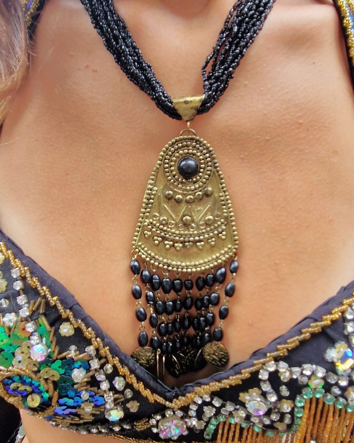 Halskette mit vielen Perlen, einem goldfarbenen Amulett und passenden Ohrringen