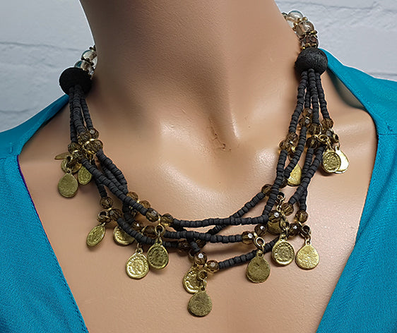 Halskette mit schwarzen Holzperlen und alten hellgoldenen Münzen