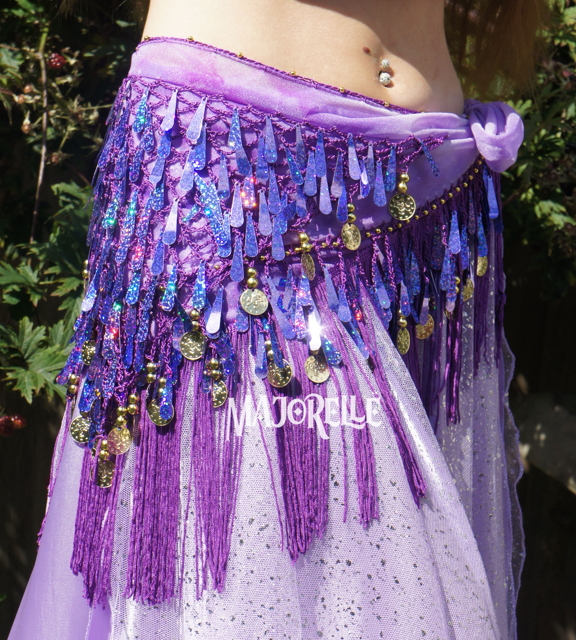 Dieses Hüfttuch mit tropfenförmigen Pailletten ist ein echter Hingucker! Die Pailletten verleihen dem Hüfttuch einen glamourösen Look. Mit einer gearbeiteten Länge von 70 cm und einer Breite von 140 cm und Länge von 150 cm (inkl. Bänder) ist dieses Hüfttuch perfekt für die Größe S/M.