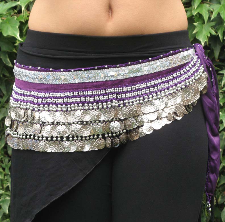 Wunderschöner Schal mit 3 Reihen silberfarbenen Münzen und einem silberfarbenen Band in Lila. Bearbeiteter Teil 75 cm lang, Gesamtlänge des Schals inkl. Knotenteil 125 cm
