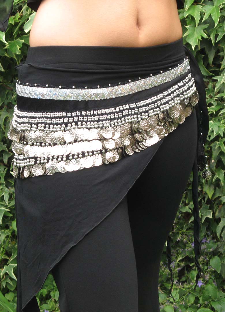 Wunderschöner Schal mit 3 Reihen silberfarbener Münzen und einem silberfarbenen Band. Gearbeiteter Teil 75 cm lang, Gesamtlänge des Schals inkl. Knotenteil 125 cm