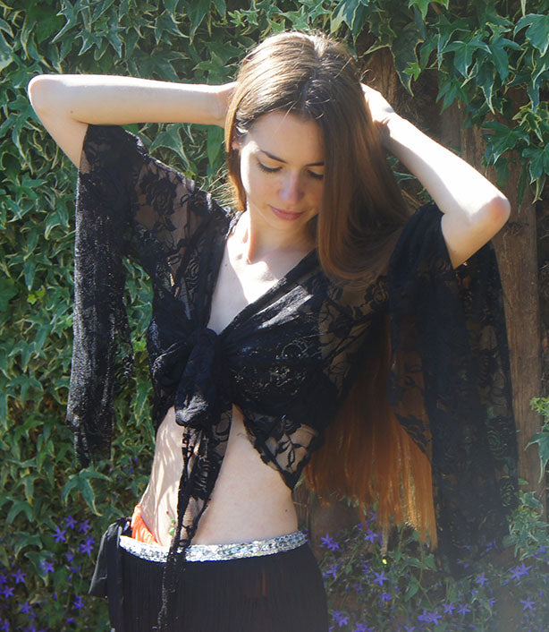 Schwarzes Bauchtanz-Top aus Spitze aus Stretchstoff mit Schmetterlingsärmeln
